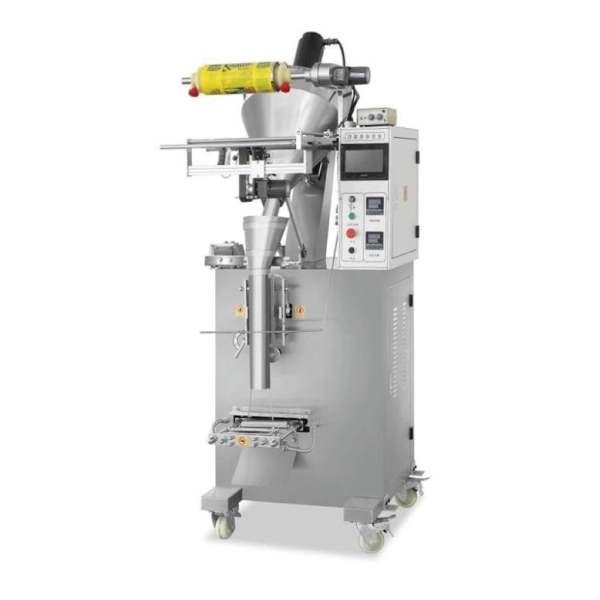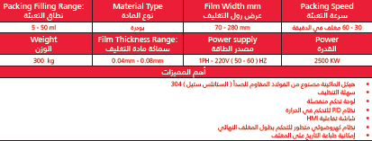 هذه الماكينة تقوم بكفاءة وبشكل أوتوماتيكي بتعبئة الأكياس ولحامها من جوانبها الأربعة، مع إمكانية طباعة التاريخ على المنتج النهائي وهي تمكنك من تعبة البودرة داخل أكياس صغيرة، مثل مسحوق الغسيل، الأماح، الحليب البودرة، النيسكافيه، السكر ، وغيرها ... تأتي هذه الماكينة مع نظام كهروضوئي ذكي يمكنك من قطع الأكياس بناءً على العلامة المائية الموجودة على رول التغليف، أو بناءً على الطول المراد الذي يتم إدخالة على الشاشة