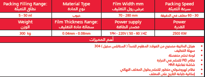 هذه الماكينة تقوم بكفاءة وبشكل أوتوماتيكي بتعبئة الأكياس ولحامها من جوانبها الأربعة، مع إمكانية طباعة التاريخ على المنتج النهائي وهي تمكنك من تعبة الحبوب داخل أكياس صغيرة، مثل البندق، والمكسرات، وحبوب القهوة ، وغيرها .. تأتي هذه الماكينة مع نظام كهروضوئي ذكي يمكنك من قطع الأكياس بناءً على العلامة المائية الموجودة على رول التغليف، أو بناءً على القياس المراد الذي يتم إدخالة على الشاشة